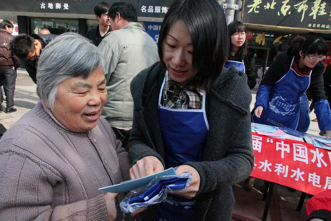 圖為工作人員向過(guò)往的居民宣傳節(jié)水、護(hù)水知識(shí)