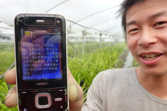 圖為農(nóng)民朋友正在查看通過(guò)“農(nóng)民信箱”發(fā)送過(guò)來(lái)的節(jié)水知識(shí)短信