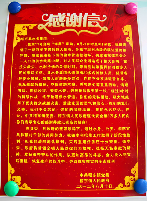 月17日,中共稽東鎮(zhèn)黨委、稽東鎮(zhèn)人民政府專程為集團(tuán)送來感謝信和錦旗,衷心感謝集團(tuán)在第11號臺風(fēng)“海葵”期間,發(fā)揚(yáng)艱苦奮斗、無私奉獻(xiàn)精神,第一時間成功搶修被毀壞的輸水總管,保障了該鎮(zhèn)人民群眾的飲水安全。