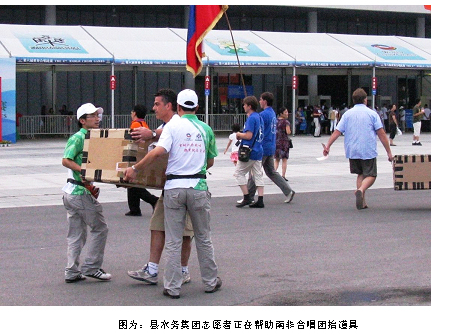 檢票口通道處突然出現(xiàn)個頭頂大箱的外國人,看他很吃力的樣子,隊員主動向前提供幫助,經(jīng)過一番的交流,得知該團(tuán)隊是來自南非的合唱團(tuán),搬大箱子的是該團(tuán)的指揮,里面裝著的是南非民族樂器打鼓,是今天晚上表演的道具,隊員們將沉甸甸的大箱打鼓搬運(yùn)到了舞臺幕后。