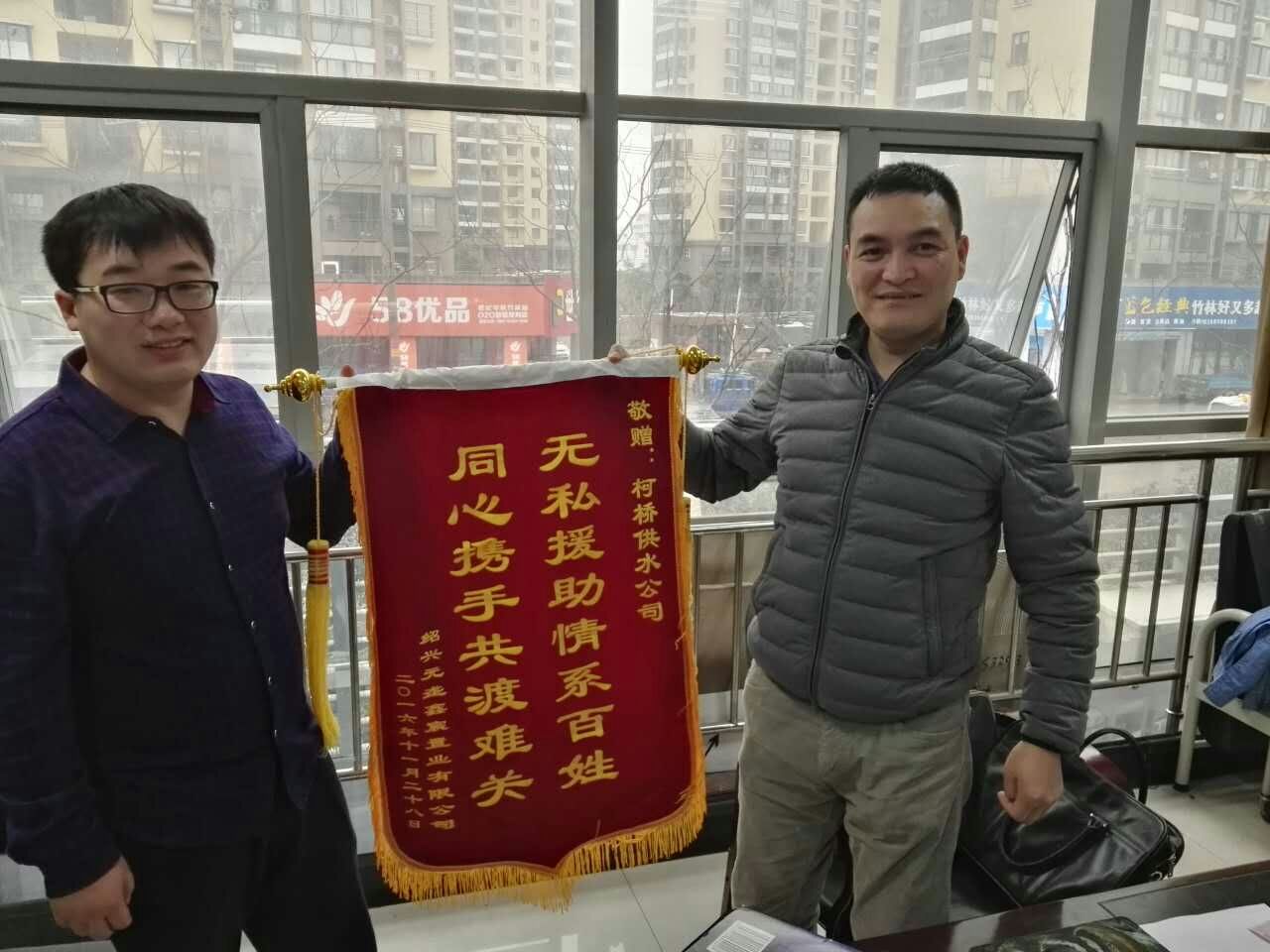 12月5日,二次供水分公司收到紹興元壟鑫宸置業(yè)有限公司大都會(huì)項(xiàng)目負(fù)責(zé)人專(zhuān)程送來(lái)的錦旗,對(duì)分公司工作人員為大都會(huì)樣板房場(chǎng)外給水管道建設(shè)提供的真情服務(wù)表示贊賞和感謝。