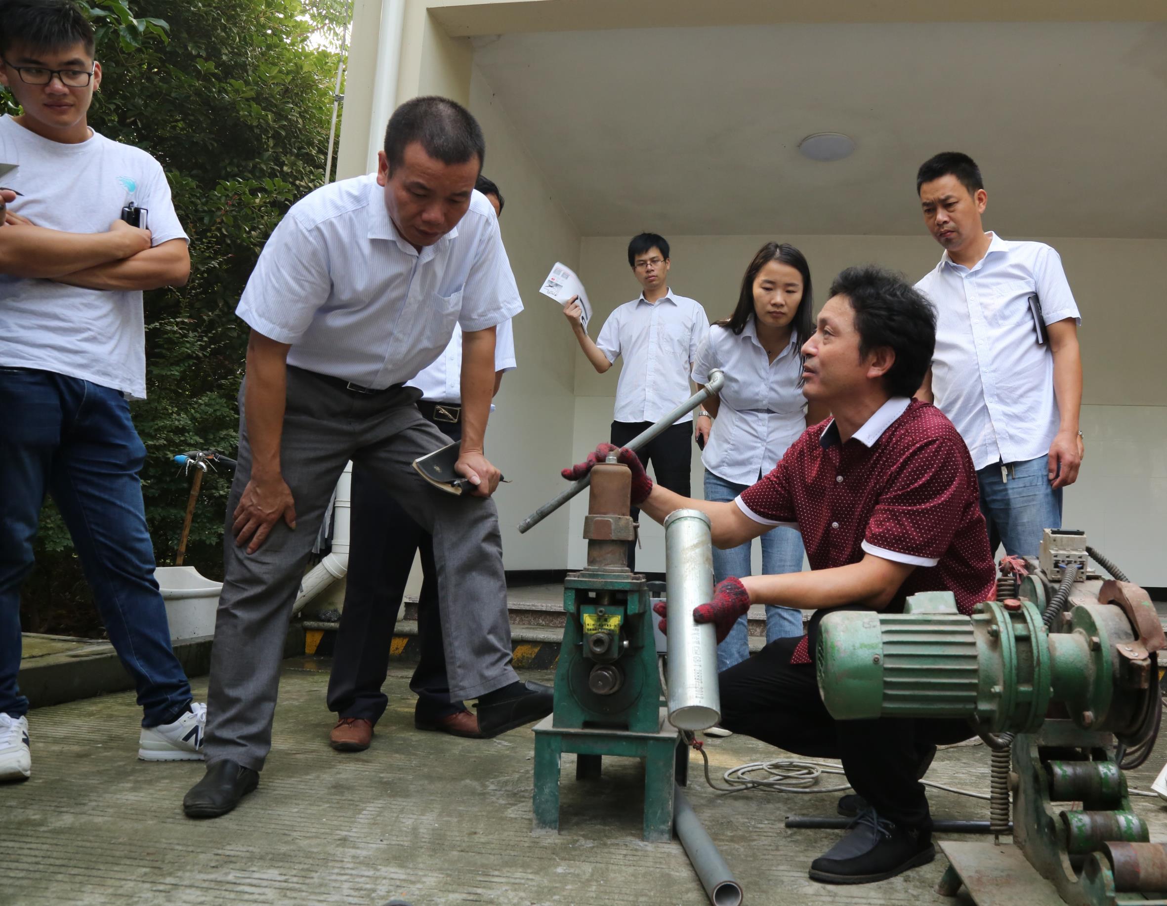 培訓(xùn)主要圍繞鋼塑管開槽施工操作、配件和鋼塑管的連接工藝展拉開,廠方技術(shù)人員示范操作結(jié)束后,還讓每位在場受訓(xùn)人員對不同口徑的鋼塑管開槽與連接進(jìn)行了模擬操作。